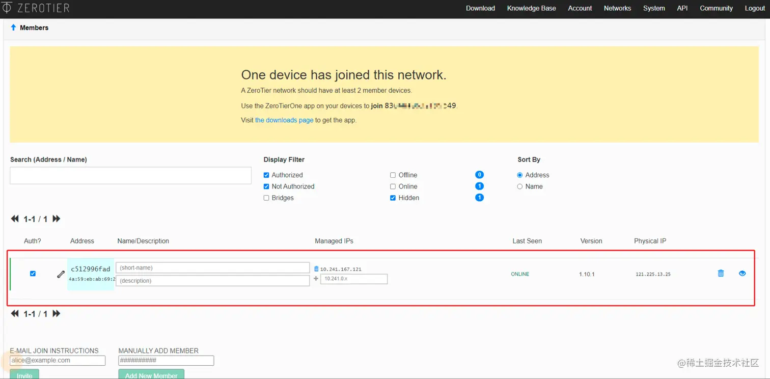 客户端加入后,zerotier的Web管理页面就能看到该网络,勾选该网络,表示同意客户端接入