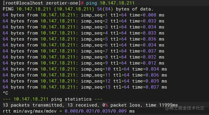 例如有两台服务器都安装了客户端,并且都加入了上面创建的网络,客户端A地址是10.147.18.122,客户端B的地址是10.147.18.211,则可以在客户端A所在的服务器上ping客户端B,测试两台机器有没有互通。