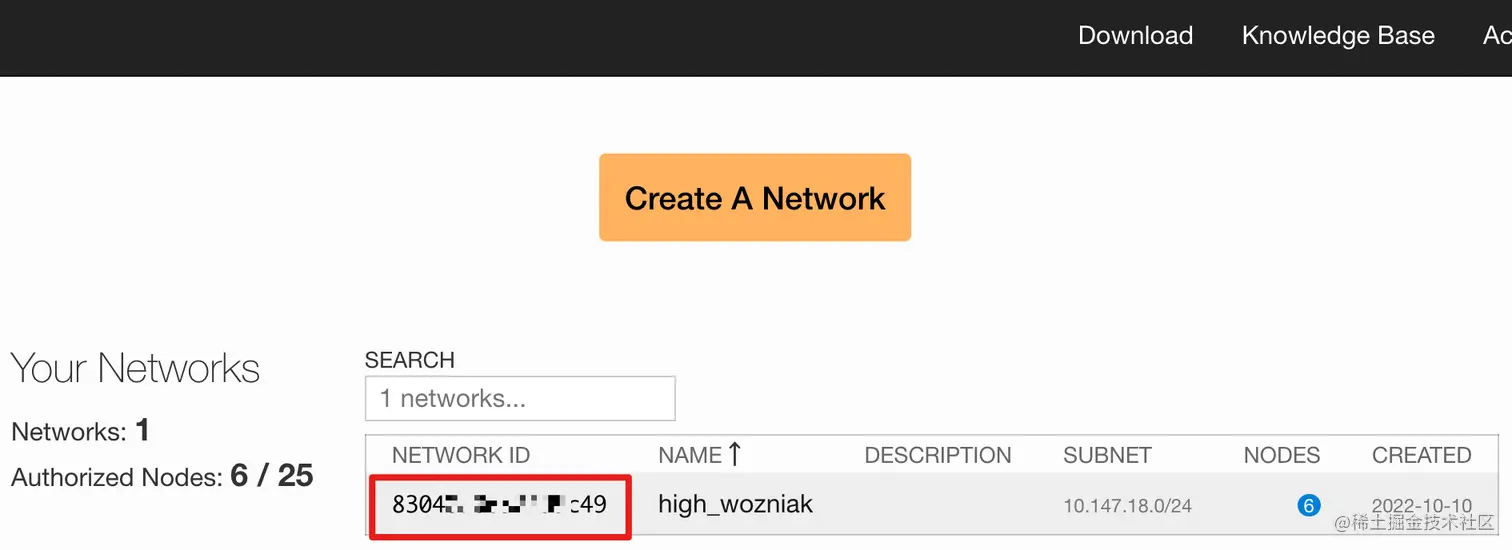 创建完成后,主页会显示这个网络,记住这个16位的NETWORK ID,后面会用到。
