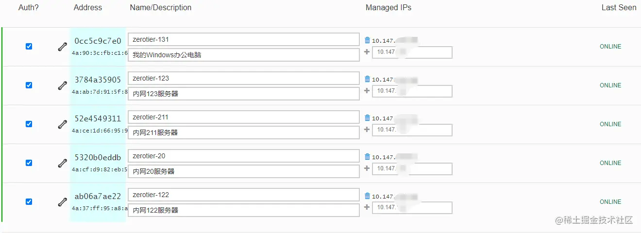 勾选后,管理端会随机分配一个IP地址给这台客户端,同时也可以自定义一个IP地址。例如我加入了多台内网服务器,并自定义了IP地址和名称: