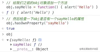 可以看到obj上确实多了一个sayHello的属性,值为一个函数,但是问题来了,obj上面并没有hasOwnProperty这个方法,为什么我们可以调用呢?这就引出了 原型。