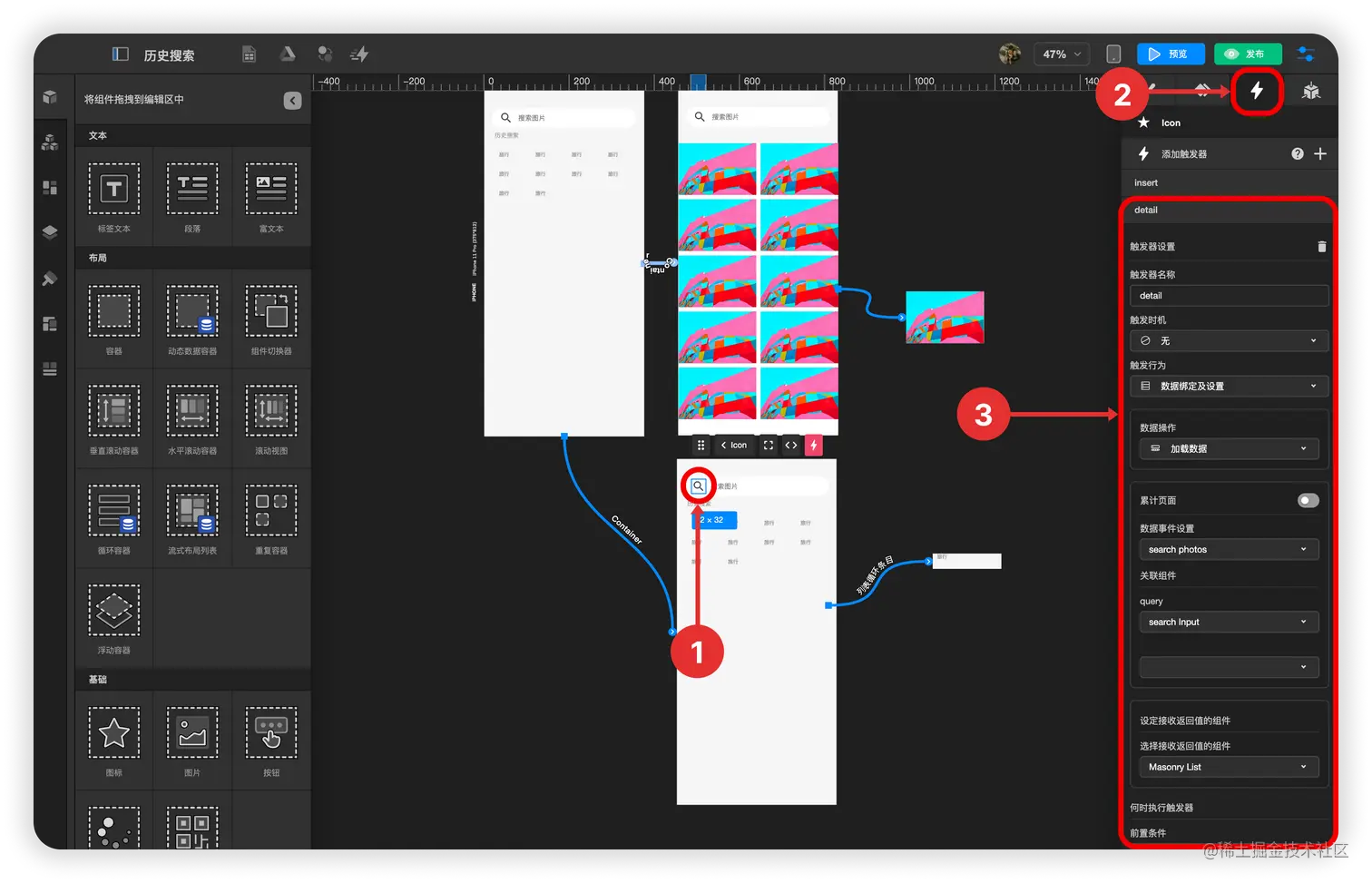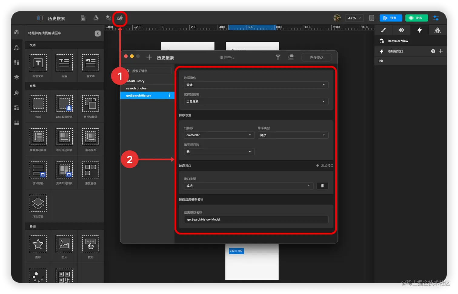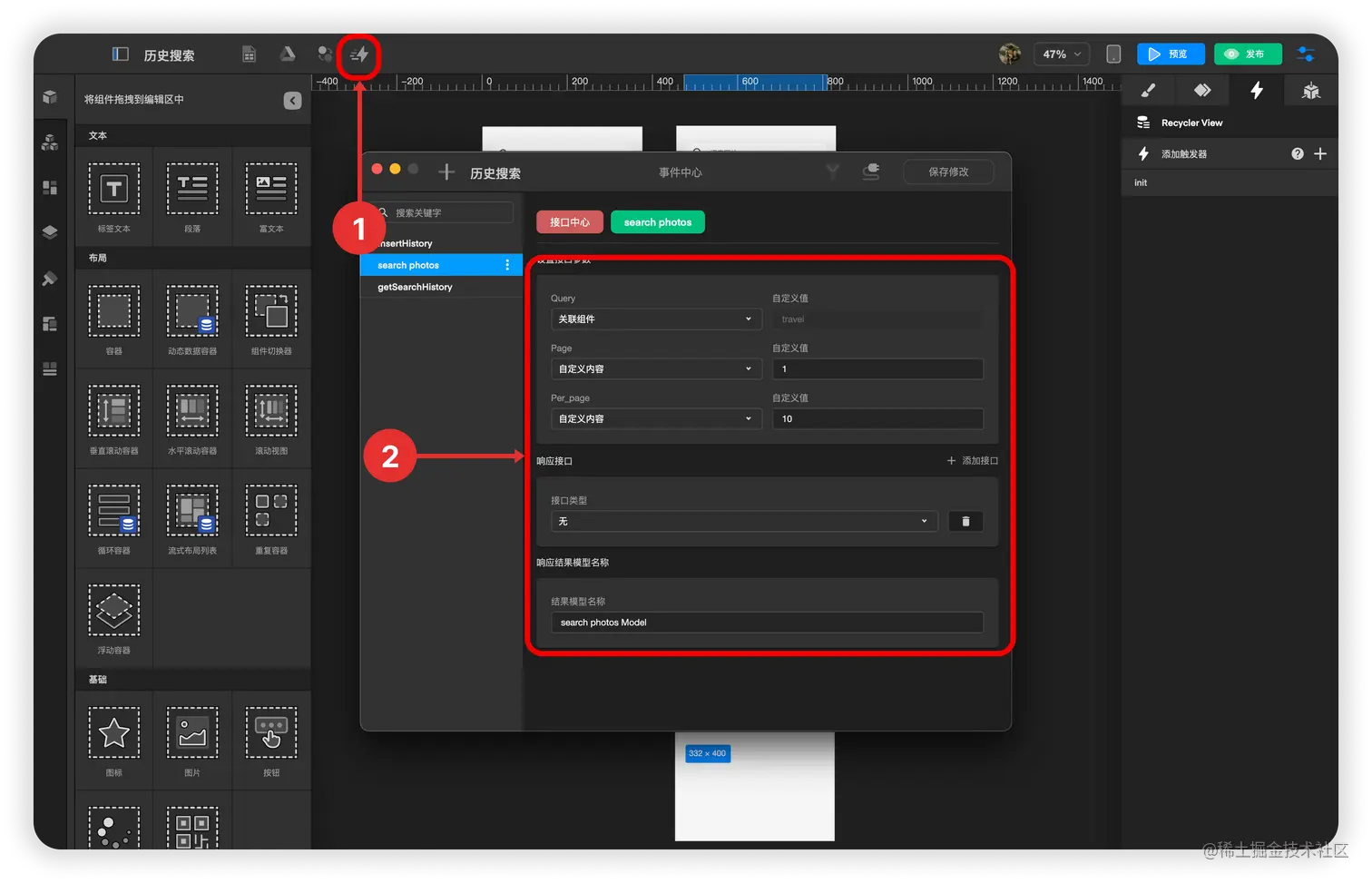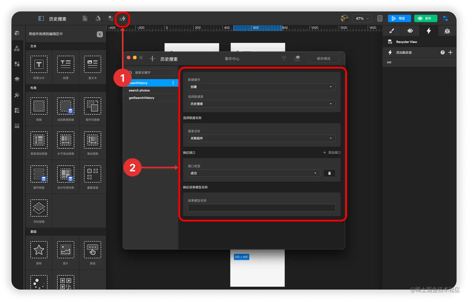 通过使用数据中心的创建事件和API Hub中定义成功的搜索图片接口实现一个历史搜索展示