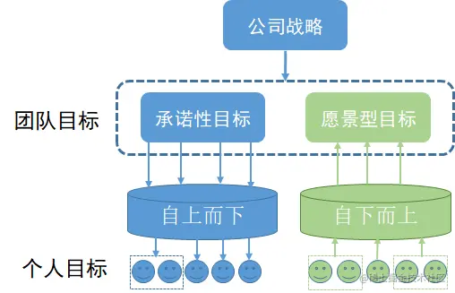 在这里我们用了“传递”和“支撑”,而不是“分解”,是期望上级能让每一个成员理解目标背后的WHY,否则,简单的分解指标,这不是又回到KPI的老路?因此,自上而下,除了传递目标本身之外,还需要传递认知,传递其背后蕴含的信息。在此背景下,下一级勇于向上一级承诺目标,呈现出自驱自组织的精神,这也是我们对承诺型目标的一种解读。