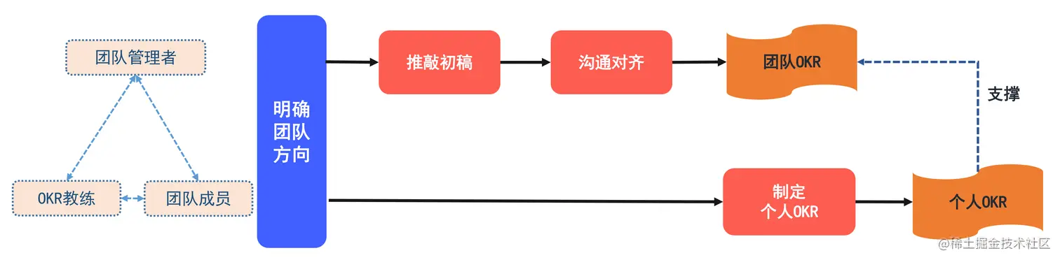 在制定完团队OKR之后,就可以启动个人OKR制定工作了。个人OKR核心是承接团队目标,有了团队OKR的存在,个人OKR的制定变得相对简单。同时我们的团队文化,也鼓励个人与团队共同成长,通过一定比例的个人成长型OKR,去构思自己还想学习什么、改变什么、挑战什么,服务更加长远的组织愿景。