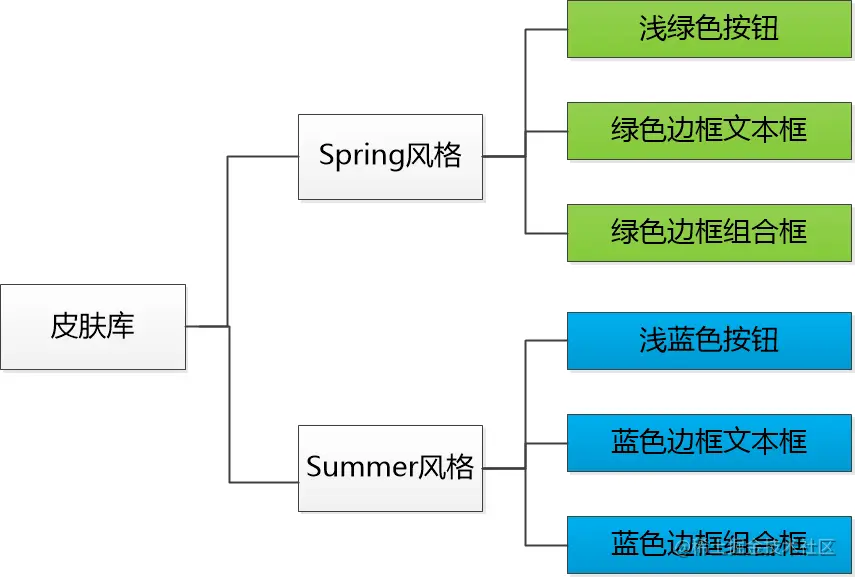 M公司IT开发部接到一个开发任务,想要对以前的一个系统开发一套界面皮肤库,可以对该桌面系统软件进行界面美化。这样,用户就可以在使用时通过菜单来选择皮肤,不同的皮肤将提供视觉效果不同的按钮、文本框以及组合框等界面元素,其结构示意图如下所示:
