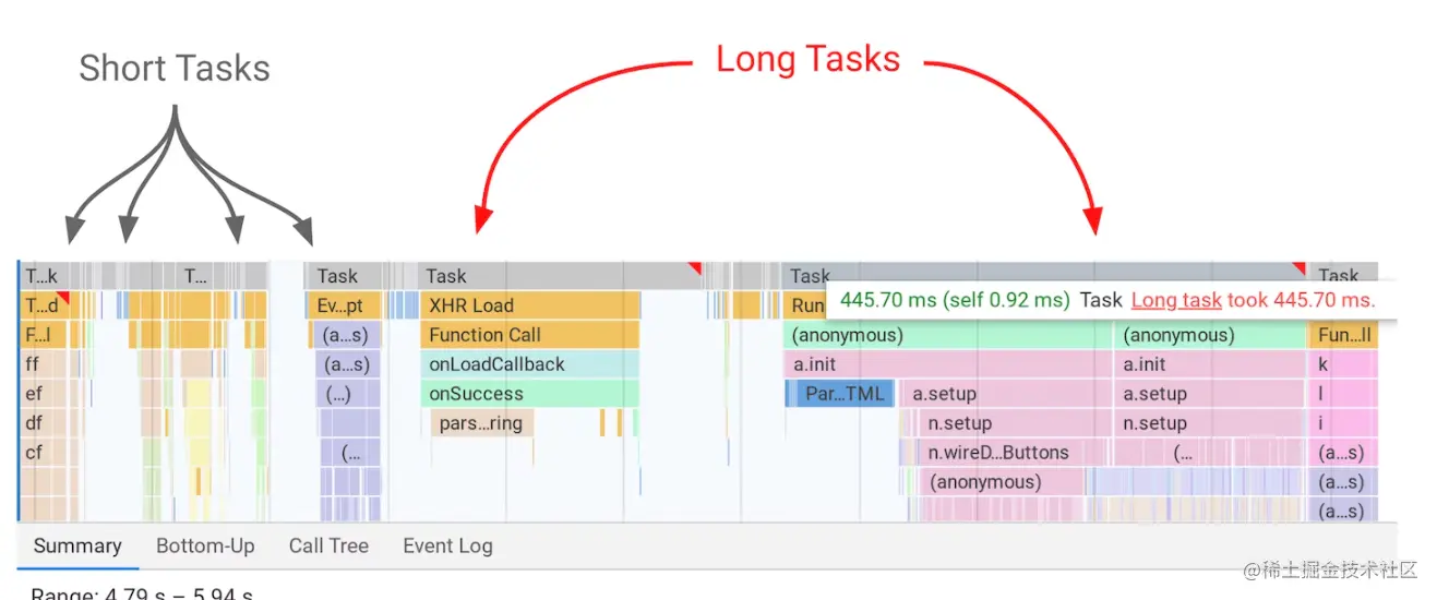到目前为止,你还需要在 Chrome DevTools 中手动查找长度超过50ms的“黄色长块”脚本,或者使用 Long Tasks API 来找出哪些任务延迟了交互性。这可能有点麻烦。