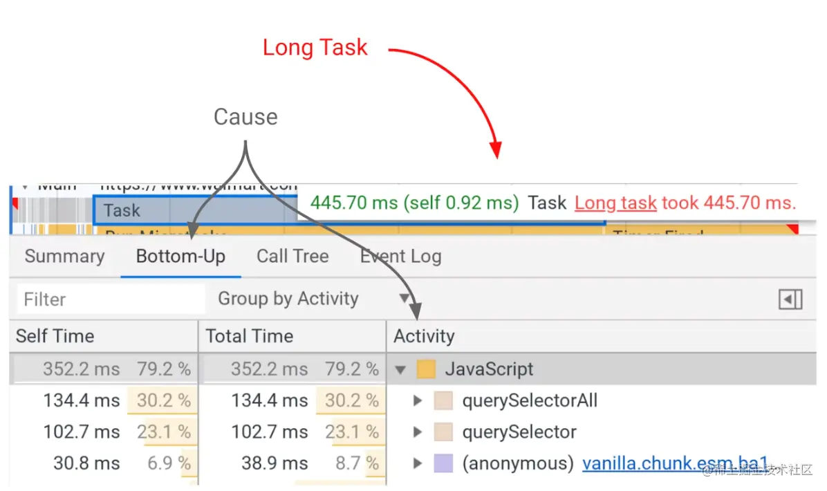 要发现导致长任务的原因,请选择灰色任务栏。在下面的抽屉中,选择自下而上和按活动分组。这使您可以看到哪些活动对耗时如此之久的任务贡献最大(总体上)。下面,它似乎是一组开销很大的DOM查询。