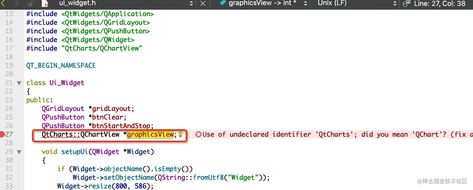 1、widget.h 中关于QT_CHARTS_USE_NAMESPACE 在6.3.0上已经没有该命名空间了,所以没必要加这行了,使用普通的命名空间就好,系统默认的就行 QT_BEGIN_NAMESPACE ,