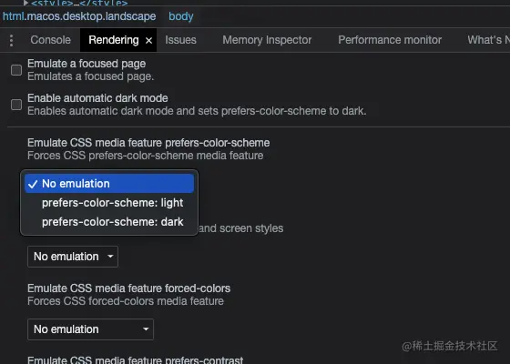 多年以前,我在 Window 7 系统适配高对比度主题时,根本没有什么像样的调试工具。当时前端社区的工程化经验远不如今天这么丰富,开发的时候只能把系统切换为高对比度主题,这个体验非常痛苦。相比之下,今天的前端开发真是太幸福了。我们最常用的 Chrome 内置了非常强大的 DevTools,可以很方便地模拟各种媒体查询属性。