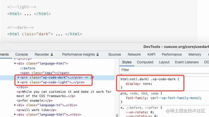 VueUse 页面中的代码高亮,适配深浅主题的做法是输出两遍 HTML,分别应用不同着色。切换页面主题时,改变他们的 CSS display 属性。这是一个很无奈的实现,它使用的代码高亮模块,并不是通过 CSS 类名来控制代码着色,而是直接输出的带行内样式的代码片段。这个案例提醒我们要认真对待技术选型。选型留了坑,将来会引入更多的坑。