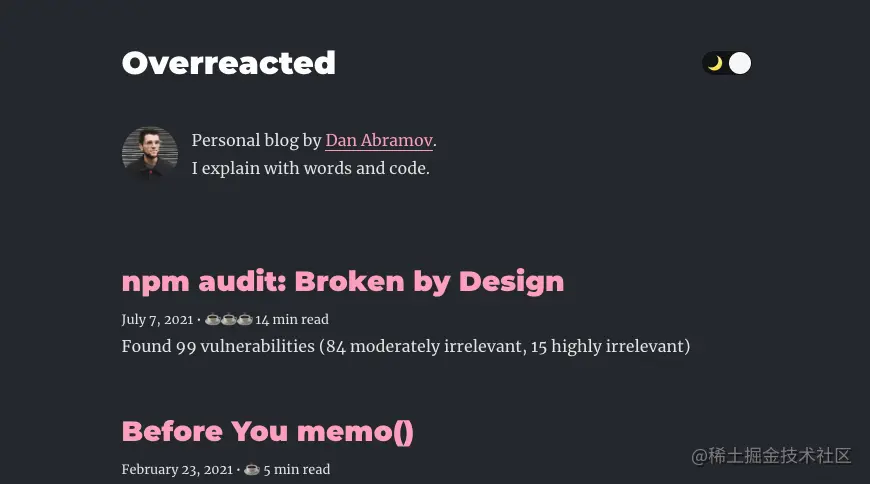 适配了深色主题的网页也有不少,比如 Redux 作者 Dan Abramov 的个人站点 Overreacted。不过他实现得比较简单,只有深浅两个选项,不能根据系统设置自动切换。