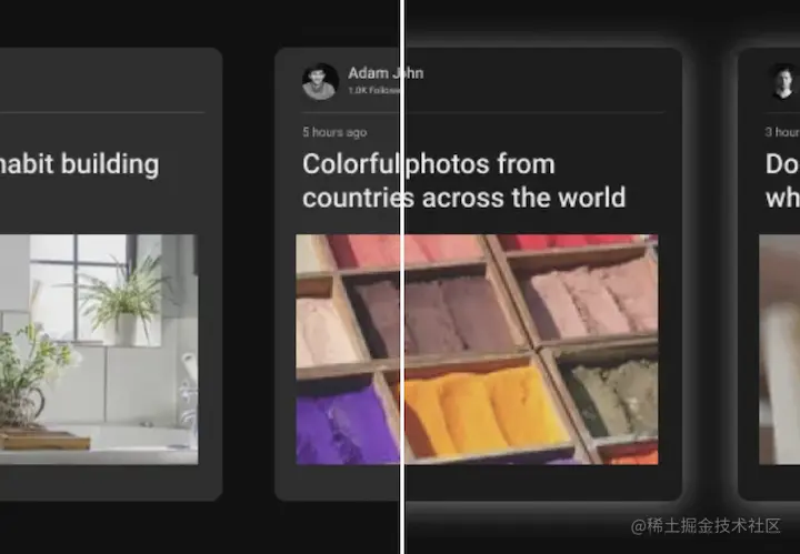 在浅色主题下,为了让容器和页面背景区分开,一个常见的做法是给容器设置灰色的盒阴影。在深色主题当中,如果我们不假思索地进行反色处理,会得到一种意想不到的霓虹灯效果。好在这还是灰色的阴影,像一些轻时尚品类的客户,喜欢在设计中大量使用鲜艳亮丽的颜色,这样处理搞不好会给人一种逛夜店甚至红灯区的观感,那就非常不合适。因此,盒阴影需要特别注意,小心处理避免尴尬。一种简单且效果不错的处理方式,是在深色模式下去除盒阴影,给容器和背景设置有一定区分度的颜色,以此来制造层次感。