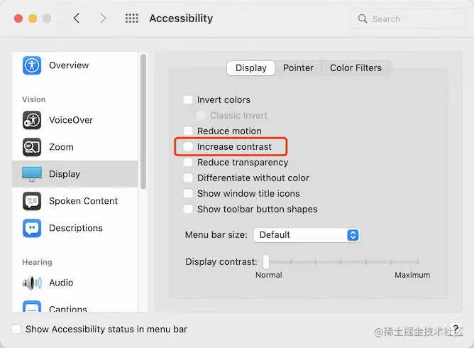 使用 macOS 设备的同学如果对高对比度模式感兴趣,也可以在辅助功能中启用「提高对比度」。如果感受不强,还可以打开 VoiceOver,关掉显示器,体验一下盲人的不易。