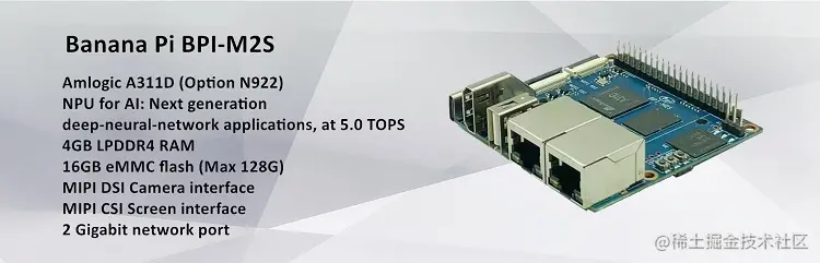 BananaPi BPI-M2S全新设计,配备Amlogic A311D四核ARM Cortex-A73和双核ARM Cortex-A53 CPU,ARM G52 MP4(6EE) GPU,NPU用于AI 5.0 TOPS,支持摄像头和MIPI-CSI接口,HDMI输出,2千兆端口。4G内存和16gb eMMC闪存.因为A311D与S922x芯片Pin to Pin兼容,也可以采用Amlogic S922x芯片。