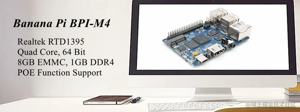 Banana Pi BPI-M4 4核64位开发板,采用RTD1395芯片设计 ,为banana pi 团队最新的Banana Pi BPI-M4具有与Raspberry Pi Model B 一样的尺寸,但搭载更强悍的Realtek RTD1395 SoC,并支援PoE网路线供电与M.2插槽等功能,使用上更具弹性。