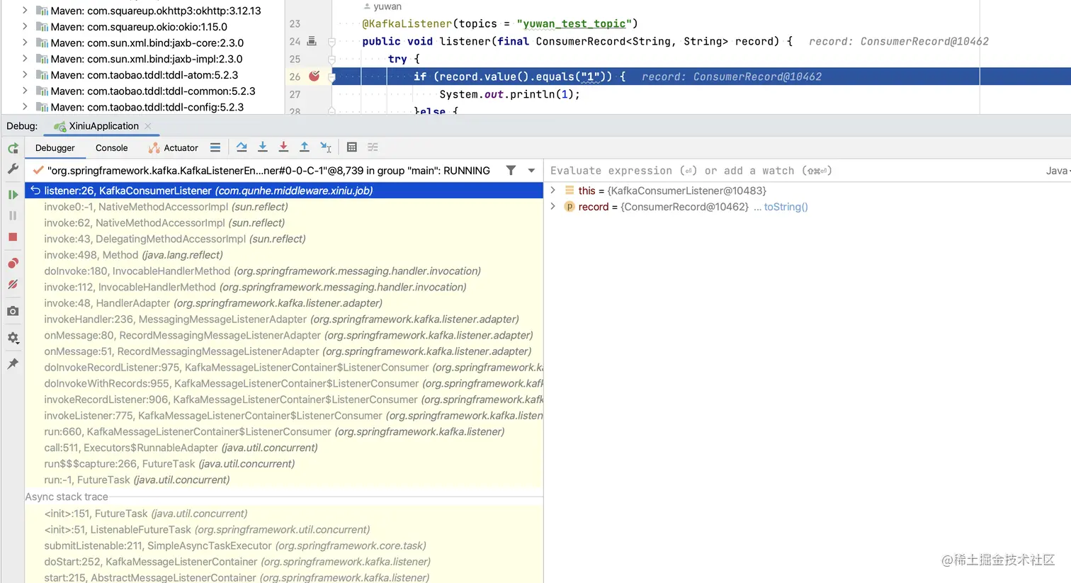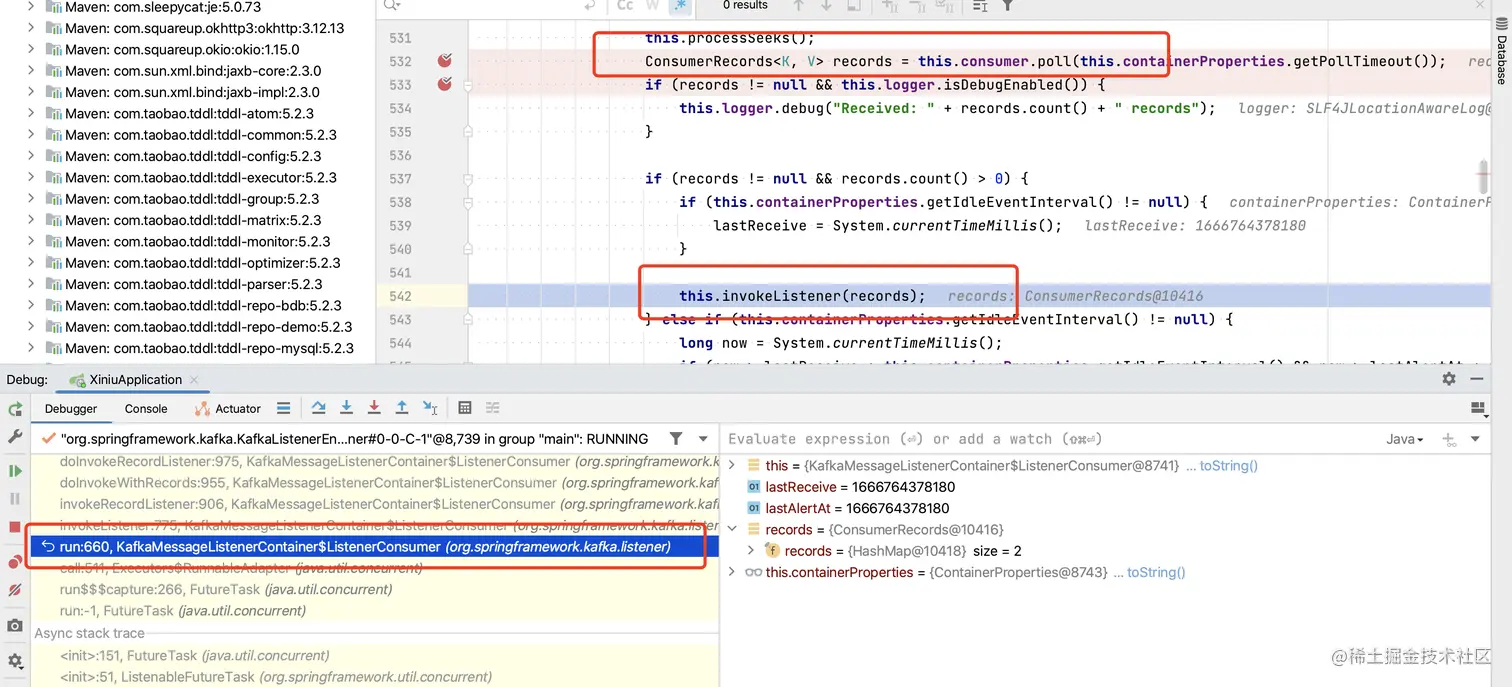 我们对消费逻辑进行断点,可以很容易看到整个调用链路。