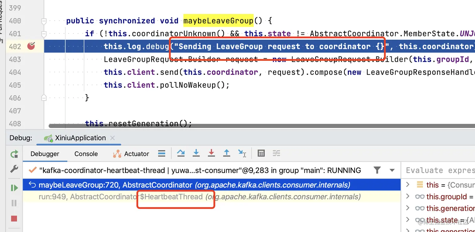 根据debug日志显示的“Sending LeaveGroup request”信息,我们可以很容易定位到自我驱逐的逻辑。