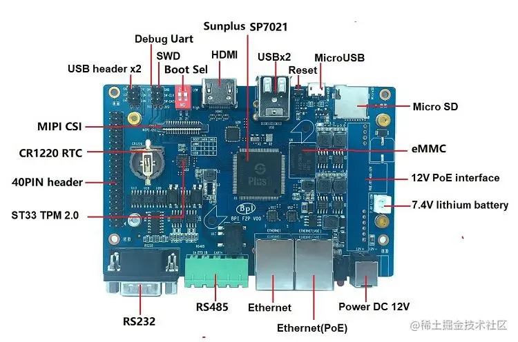 香蕉派 BPI-F2P 是采用Sunplus 工业级芯片方案设计, 是完全按照工业级应用标准设计的开发板. 使用 Plus1(sp7021) 芯片设计,跟Banana Pi BPI-F2S采用同样主控芯片, 支持PoE网线供电功能,支持一路 RS232,一路RS485 .你可以让一款真正的工业控制网关完成你想的产品设计。
