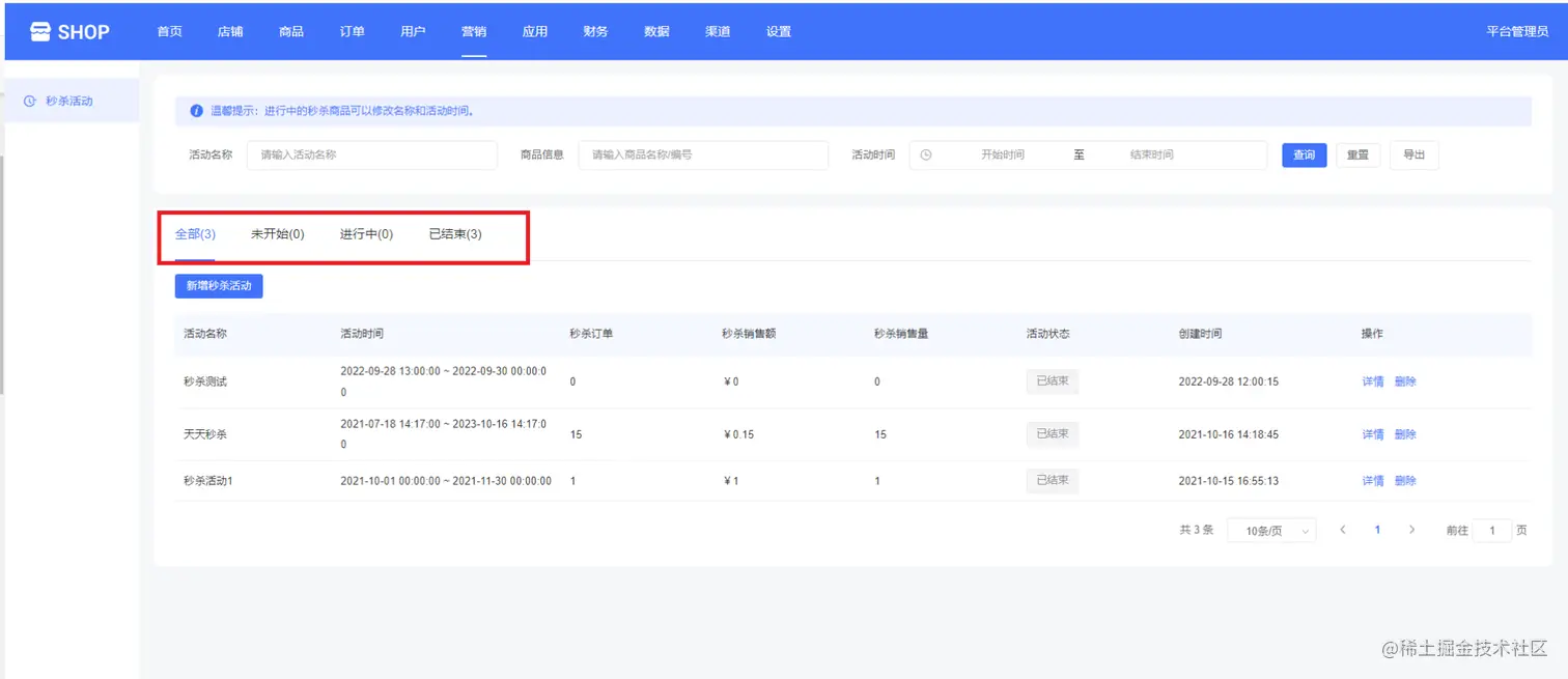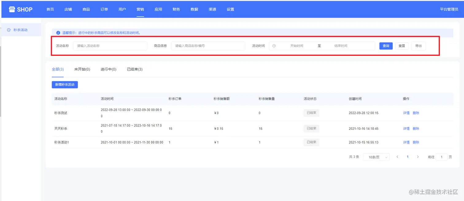 平台管理可以输入活动名称、商品名称/编号、活动时间等查询搜索活动,如下图所示: