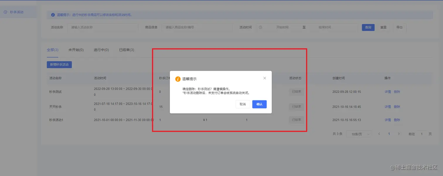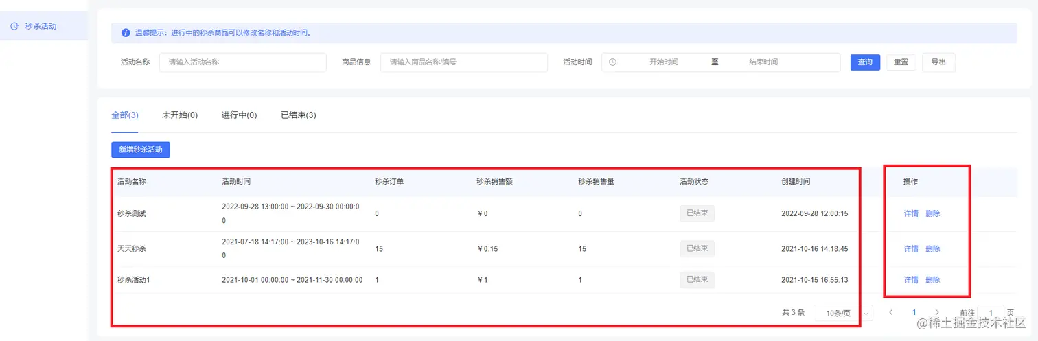下面可以看到活动名称、活动时间、秒杀订单、秒杀销售额、秒杀销售量、活动状态、创建时间等,还可以进行详情、删除等操作,如下图所示: