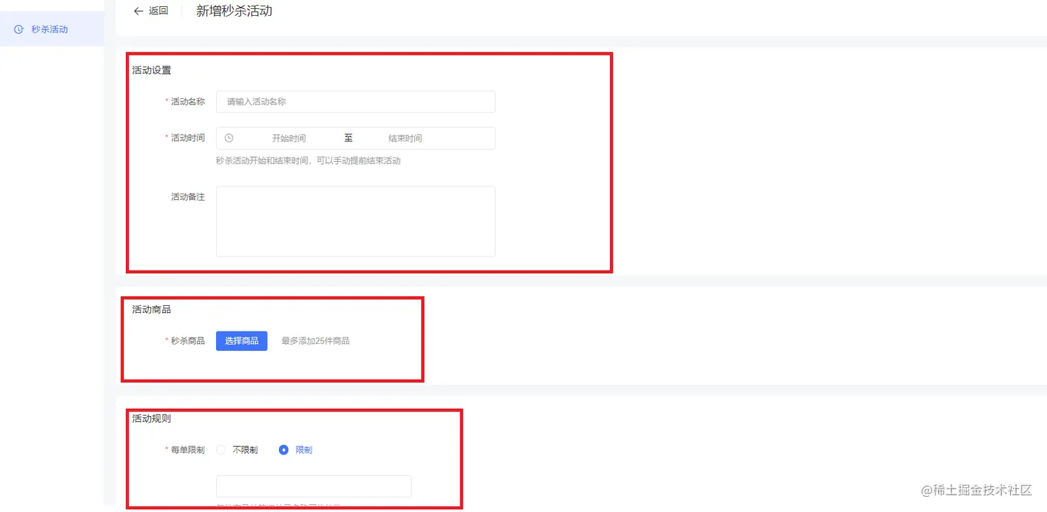 点击新增秒杀活动,输入活动名称、选择活动时间(秒杀活动开始和结束时间,可以手动提前结束活动)、活动备注等活动设置,选择活动秒杀商品(最多添加25件商品),选择每单限制,限制限制需要输入每件商品单笔订单最多购买的件数,如下图所示: