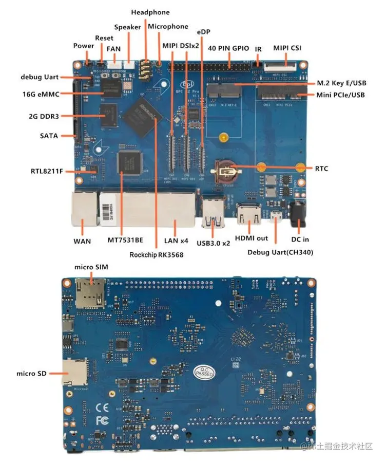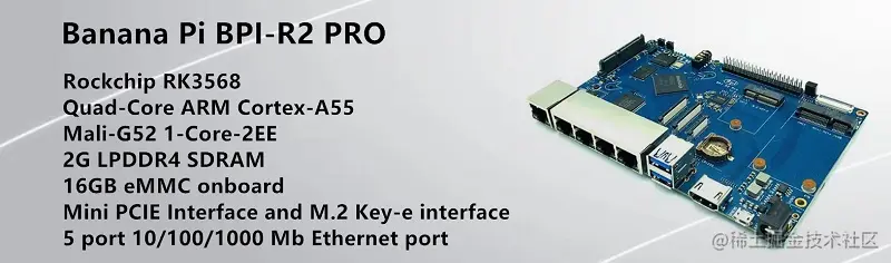 Banana Pi BPI-R2 Pro 开源路由器采用Rockchip RK3568芯片方案设计, 板载2GB LPDDR4内存和16GB eMMC存储,支持2个USB 3.0接口,5千兆网口。M.2 Key-e和mini PCIe接口,2 mipi DSI接口(可通过软件切换LVDS), 1个CSI摄像头接口,1个HDMI输出.支持Android,Linux,OpenWRT系统