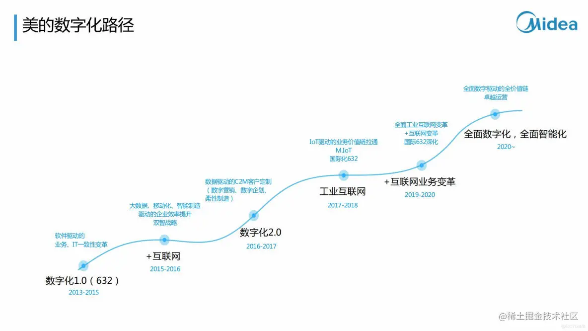 美的已经是一家数字化、智能化驱动的科技集团,拥有数字驱动的全价值链及柔性化智能制造能力。美的集团确定的核心战略就是全面数字化和全面智能化,要把全部的产品用软件来定义,用内容增强用户的服务,来改变美的的交互方式。