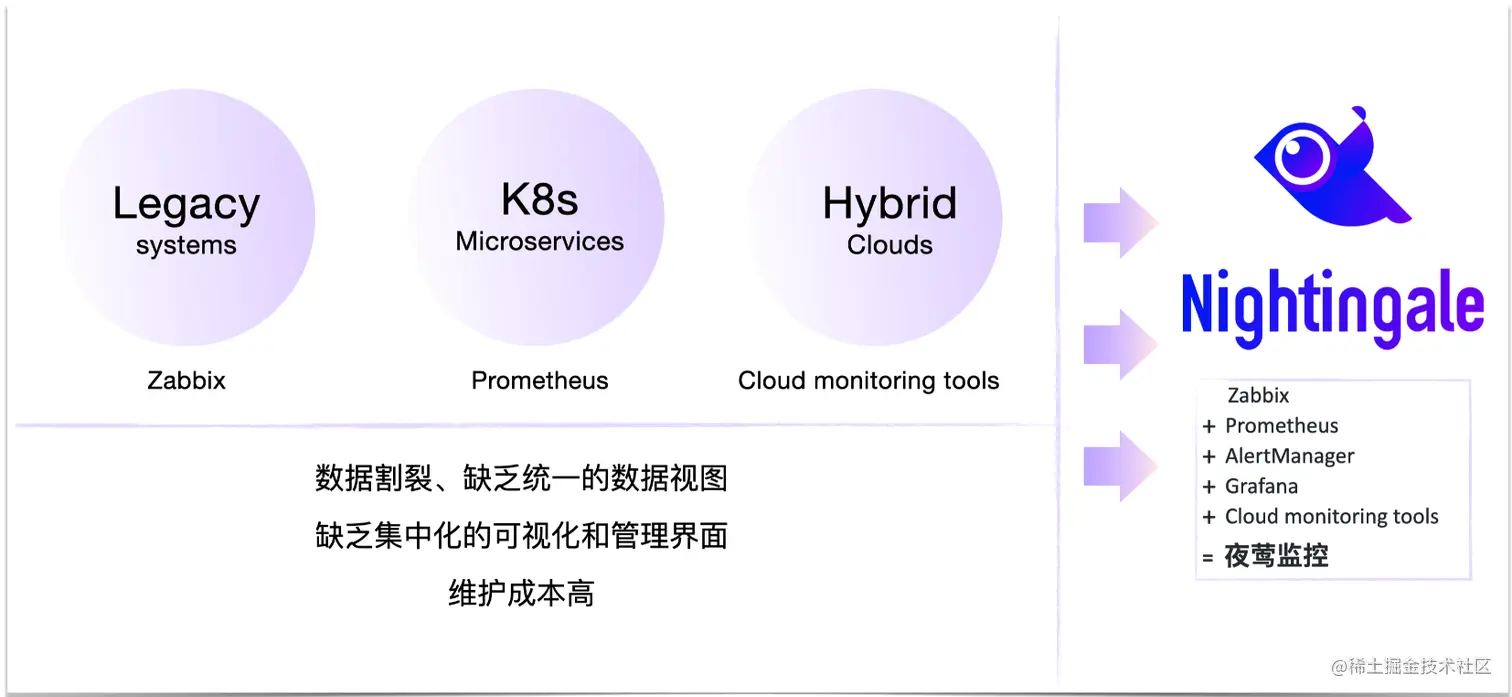 显然,老架构用 Zabbix,微服务架构用 Prometheus,多云监控用云厂商各自提供的云监控,工程师被迫维护和使用多套监控系统,并不是大家期望的最佳局面。那么,有没有一个现代化的、简单好用的监控产品,既可以满足传统架构的监控需求,又可以适用K8s时代微服务架构的监控、混合云的监控?