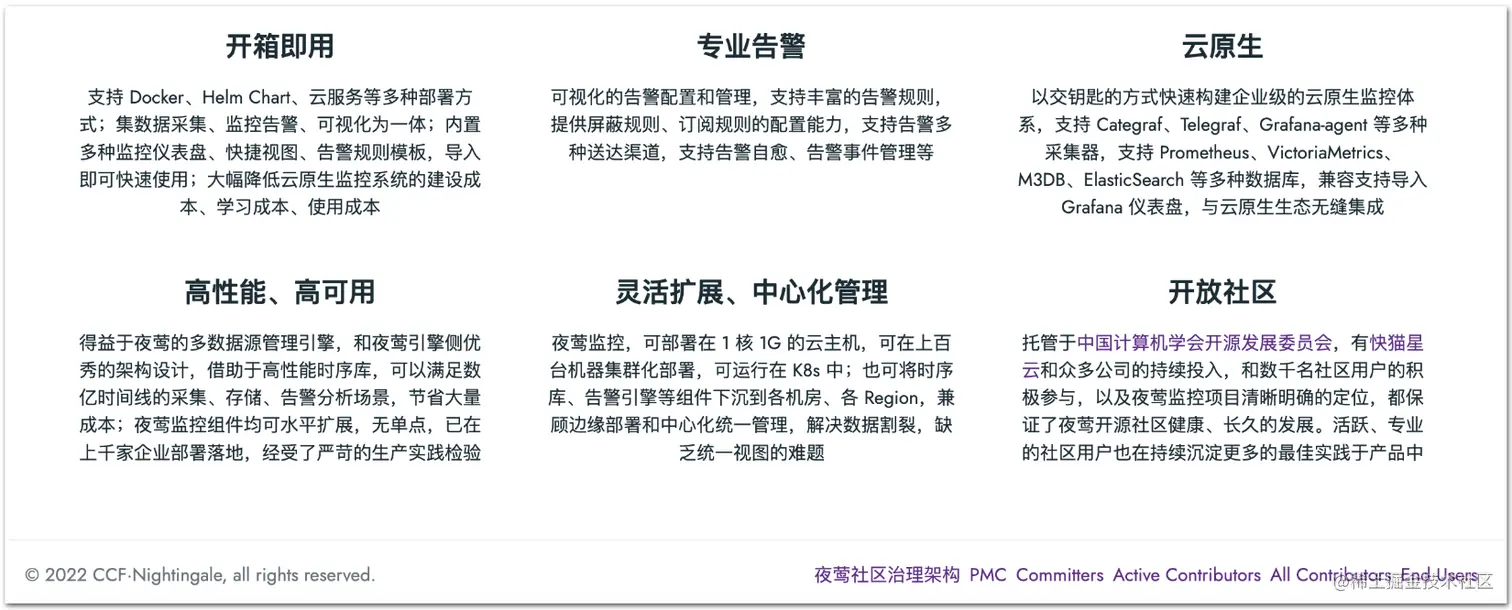 今天给大家详细介绍一款现代化的开源监控解决方案—夜莺监控 | Nightingale[4]。夜莺监控,采用 All-in-one 的产品化设计理念,集数据采集、可视化、监控告警、故障协同处理于一体,与云原生生态紧密集成,提供开箱即用的企业级监控分析和告警能力。于 2022 年 5 月 11 日,捐赠予中国计算机学会开源发展委员会(CCF ODC),为 CCF ODC 成立后接受捐赠的首个开源项目。