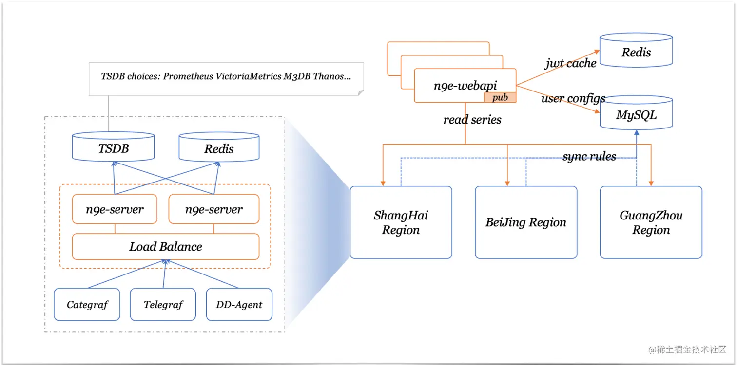webapi 无状态,中心端部署,承接前端frontend的请求,将用户配置写入数据库,同时对外提供API 供frontend 使用;server 是告警引擎,也承担数据处理、转发功能,一般伴随着时序数据库部署,一个时序库就对应一套 server,每套 server 可以只启动一个实例,也可以启动多个实例组成集群。server 可以接收 Categraf、Telegraf、Grafana-Agent、Datadog-Agent、Falcon-Plugins 等多种数据采集器上报的数据,写入后端时序数据库,并周期性从数据库同步用户配置的告警规则,查询时序库进行告警判断。此外每套 server 依赖一个redis作为队列,比如产生的告警事件会进入到不同的队列。