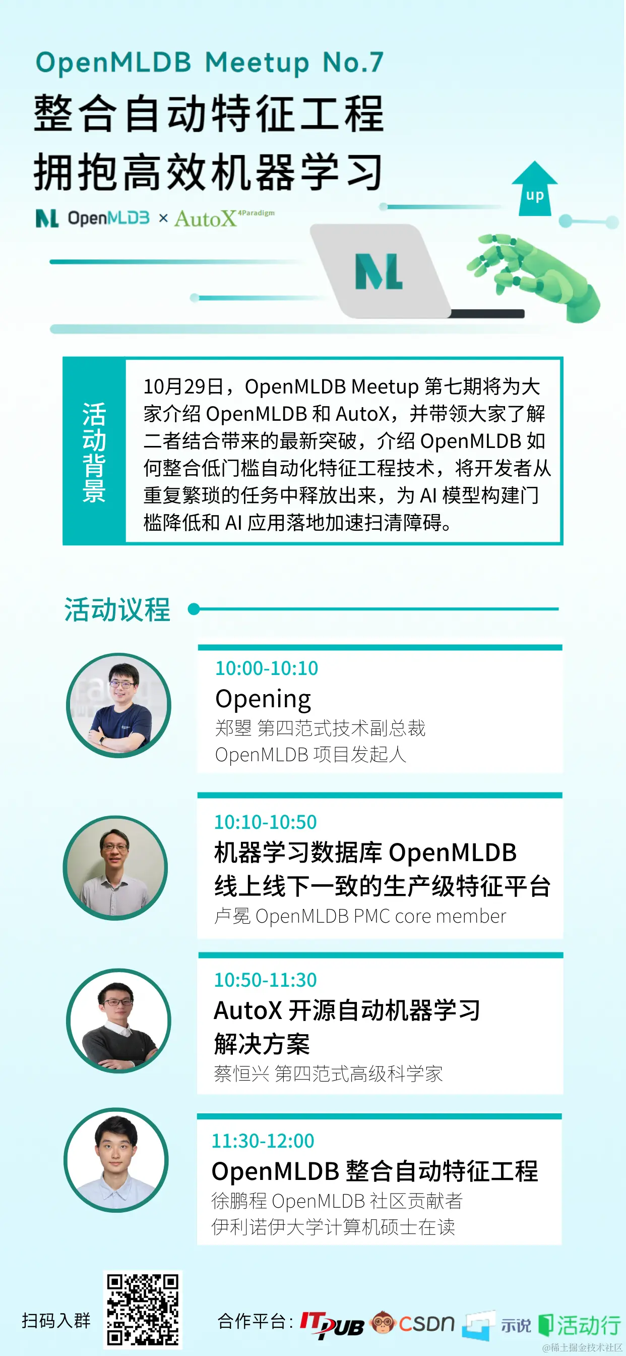 具体日程参见海报,直播信息会在 OpenMLDB 技术交流群中同步,欢迎未进群的朋友入群收看~