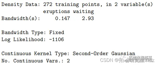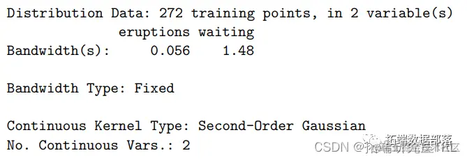 间歇泉是位于黄石国家公园的旅游景点。这个包含 n = 272 次观测的著名数据集由两个变量组成,以分钟为单位的喷发持续时间(以分钟为单位)和等待下一次喷发的时间(以分钟为单位)。公园服务使用此数据集来模拟预期持续时间,具体取决于自上次喷发以来经过的时间量。然而,对联合分布进行建模本身就很有意义,并且核估计器很容易揭示联合 PDF 和 CDF 的基本双峰性质。在本例中,我们加载旧的间歇泉数据并计算密度和分布函数。结果如图所示。请注意,在此示例中,我们一步进行带宽选择和估计