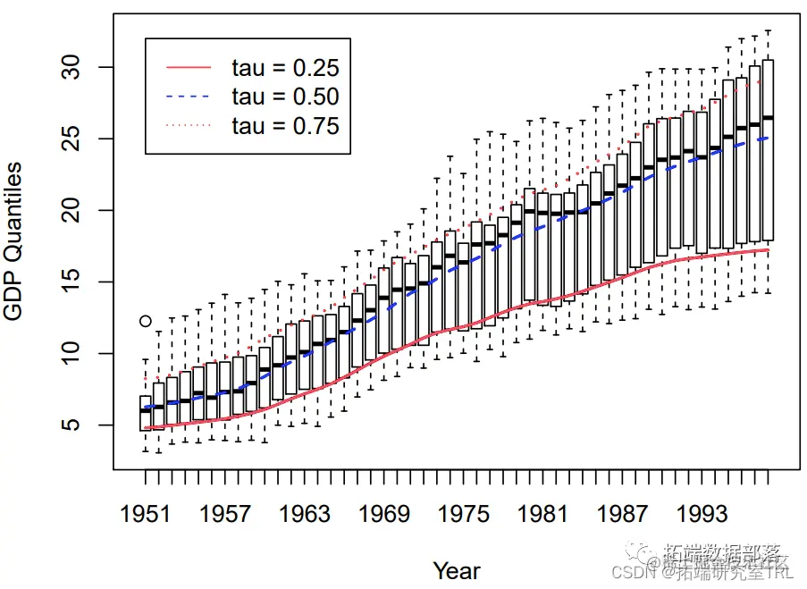 此应用程序的一个很好的功能是解释变量是有序的,并且每年存在多个观测值。将绘图函数与有序数据一起使用会生成一个箱线图,该箱线图很容易显示非平滑的第 25、50 和 75 个分位数。然后可以直接将这些非平滑分位数估计值与通过直接估计平滑CDF获得的估计值进行比较,如图所示。