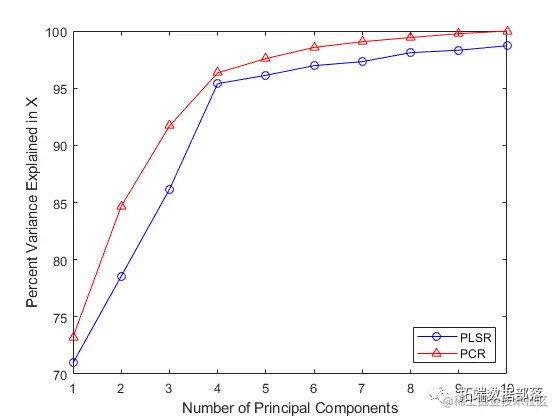 对于本例中使用的数据,PLSR和PCR所需的成分数量之间的差异不是很大,PLS权重和PCA载荷选择了相同的变量。其他数据可能并非如此。