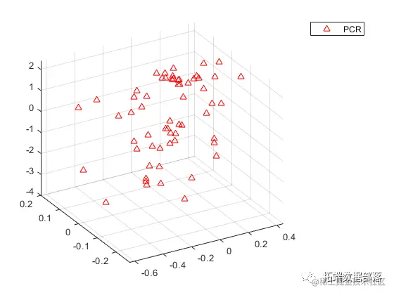 如果不能以交互方式旋转图形,有点难以看到,但上面的PLSR图显示了紧密分散在平面上的点。另一方面,下面的PCR图显示点几乎没有线性关系。