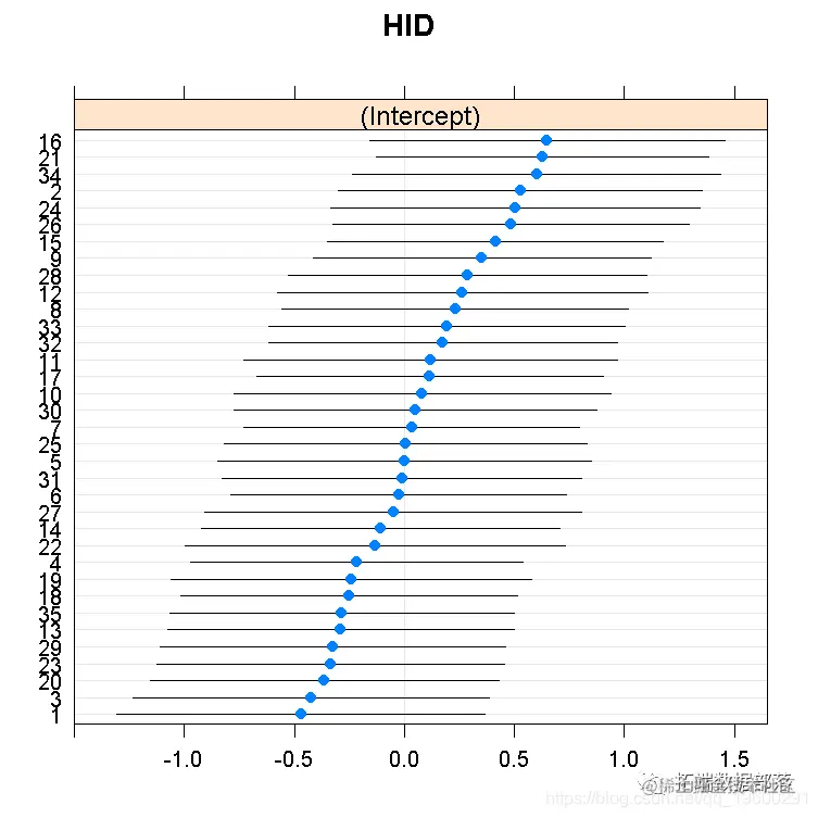 看一下条件模型的分布也是很有用的,下面我们用“毛毛虫图”来做。蓝点是带有误差条的条件模型。我们对医生和医院都是这样做的。例如,对于医生来说,我们可以看到一个有点长的右尾,即极端的正值比负值多。