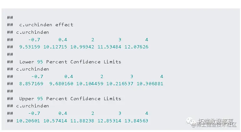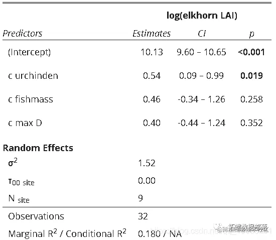 第一部分告诉我们,估计值是基于自适应高斯-赫米特的似然性近似。为了避免出现不收敛的警告,我们用参数control=glmerControl(optimizer="bobyqa")指定不同的优化器。