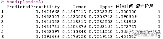 下面我们使用glmer命令估计混合效应逻辑回归模型,Il6、CRP和住院时间为患者水平的连续预测因素,癌症阶段为患者水平的分类预测因素(I、II、III或IV),经验为医生水平的连续预测因素,还有DID的随机截距,医生ID。