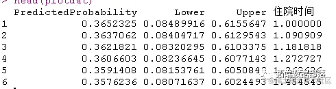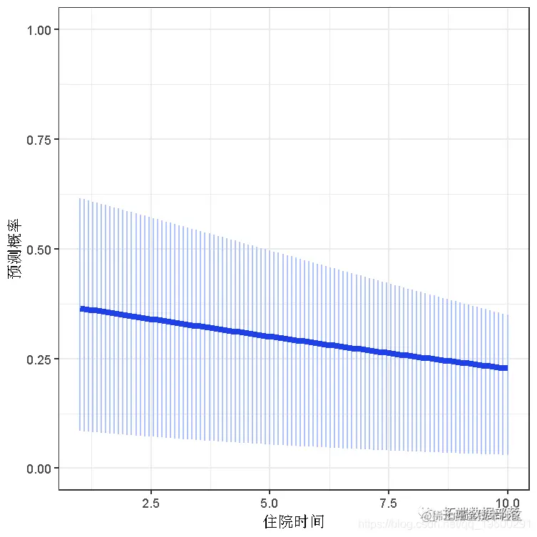 现在我们有了一些背景和理论,我们看看如何实际去计算这些东西。我们得到一个住院时间(我们感兴趣的预测因子)的摘要,然后在其范围内得到100个值,用于预测。我们复制一份数据,这样我们就可以固定其中一个预测因子的值,然后使用预测函数来计算预测值。默认情况下,所有的随机效应都被包括在内。