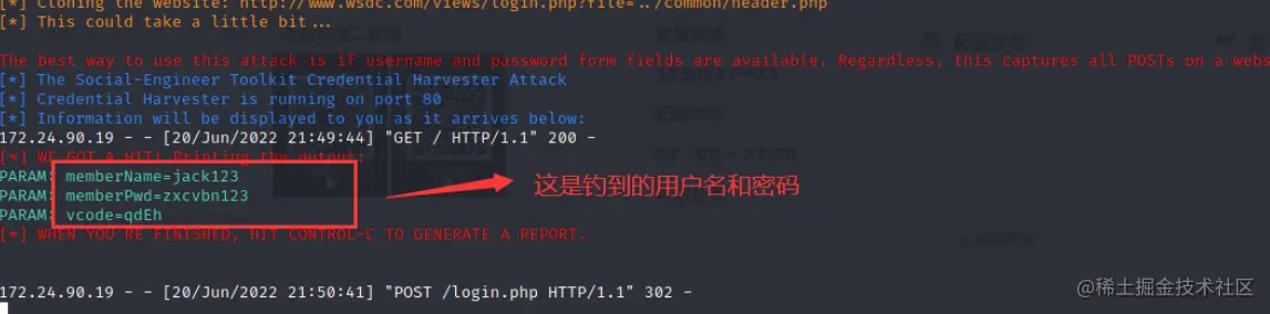 制作完钓鱼网站,就可以开始钓鱼,如果有人点击这个网站,并输入信息,就可以在我们后台反馈: