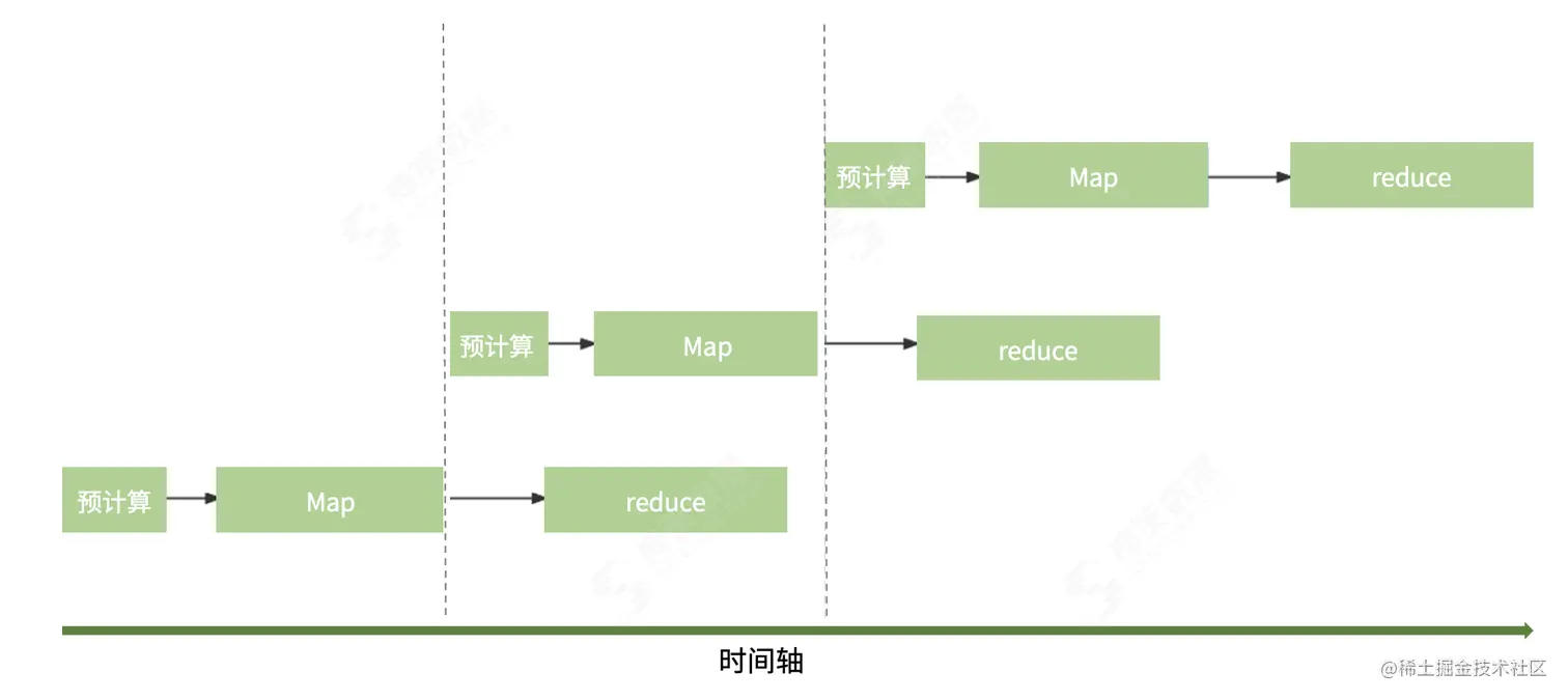 流水钱提交导入方案能够有效避免前置预估带来的额外开销。在此次导入的 MapReduce 运行期间,如果未导入的数据量足够多且本次的 Map 已完成,那么便会启动下一次的预计算,保证下一次的导入只需要计算资源而没有预计算的额外开销;如果预计算任务先于此次导入完成,那么在具备充足资源的前提下会直接提交下一次的导入任务,进一步提高数据导入的并行度。提交流水线如下: