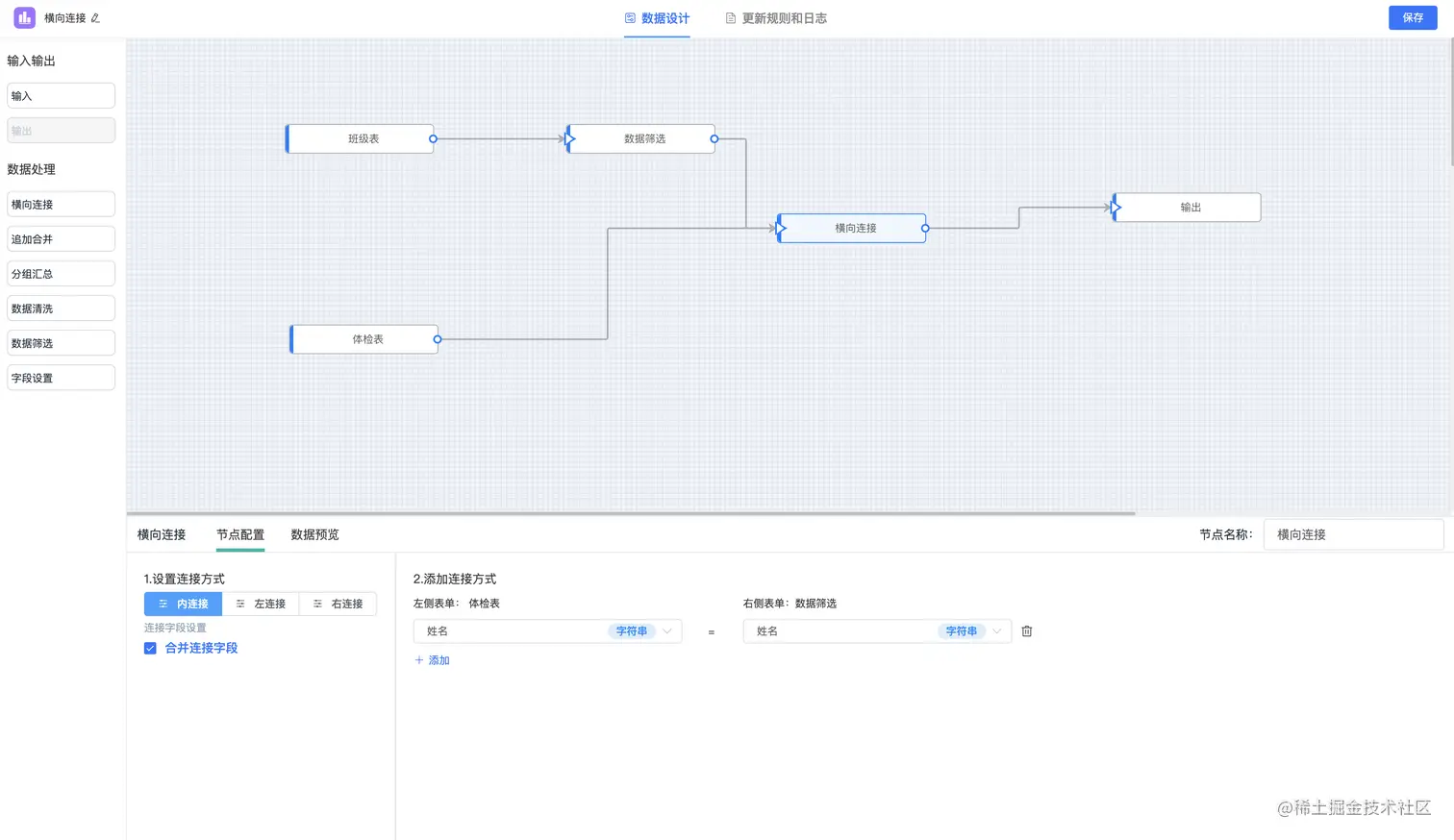 - 能力节点:输出节点、横向连接、追加合并、分组汇总、数据清洗、数据筛选、字段设置
