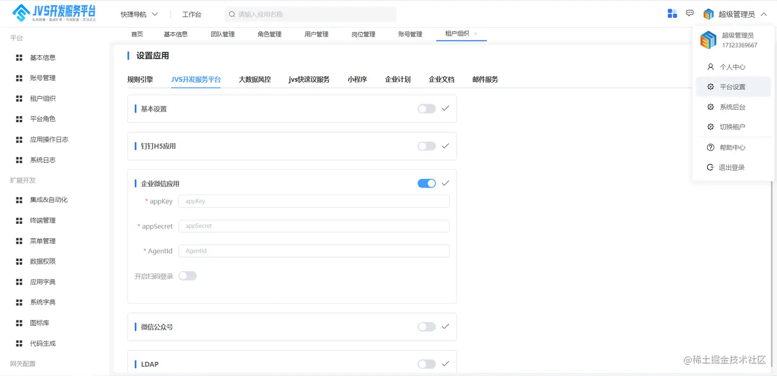- 将管理功能拆分,分为平台级的管理能力与租户级的管理能力。平台级功能是针对整个环境的配置,其中包括平台的基础信息,租户的角色、逻辑引擎扩展的组件配置。