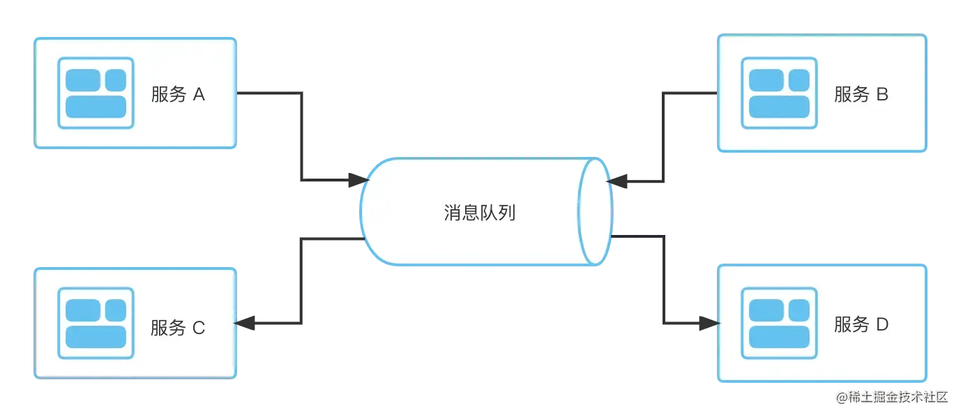 相信无论是前端还是后端的同学,不管是在平常的自我充电、还是日常的工作中,对 RocketMQ、Kafka 等主流消息队列多多少少都有一定的了解。现在的服务端架构中,一个业务模块中的服务往往会根据一定维度拆分成多个服务。而消息队列大家可以理解为 多个服务、系统之间沟通的通道,如下图所示: