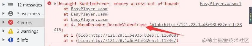 1)打开控制台,发现有报错出现:Uncaught RuntimeError:memory access out of bounds。从报错看,是底层的Wasm解析失败。