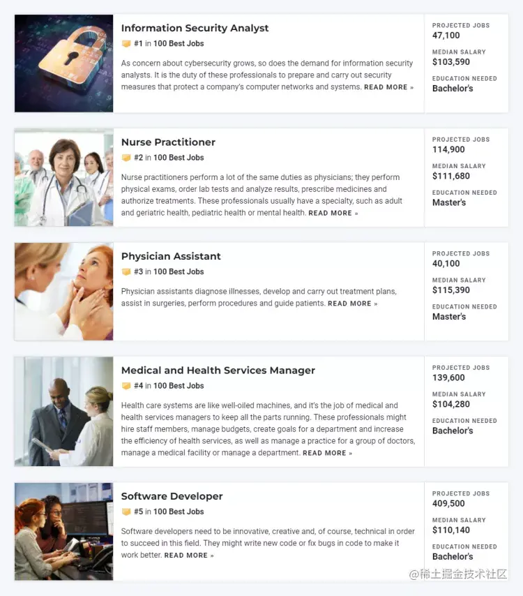 排名前五的职业分别是信息安全分析师、执业护士、医生助理、医疗卫生服务经理和软件开发工程师,网络攻击的威胁不断增加,新冠疫情的反复爆发,导致对信息安全和医疗卫生这两个行业的人才需求越来越强烈。而软件开发工程师的火热则代表了发展趋势。