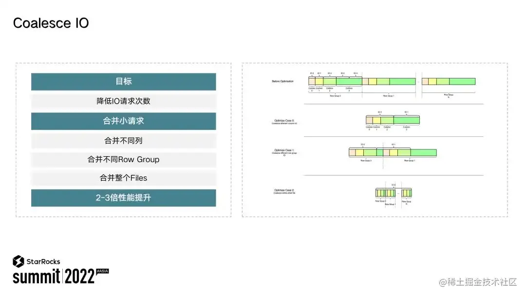 针对湖上单次 IO 请求延时比较高的情况,为了能够让分析执行地更迅速,StarRocks 支持了 Coalesce IO用于合并小的 IO 请求,通过减少 IO 次数,增加每次 IO 的请求量,这样就能够提升整个查询时延。