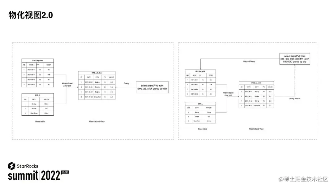 图右展示的是 StarRocks 能够将用户对原表的查询自动改写为对物化视图的查询。这里的物化视图起到的是一个透明加速的能力。