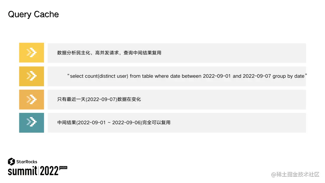 为了能够最大限度地利用查询中间结果,StarRocks 支持的是 tablet 级别的 cache,并不是最终结果的 cache;为了能够更快地加速查询,StarRocks 采用的是 sub-plane result cache;另外 StarRocks 的 cache 还支持 join、聚合等各种复杂算子。查询执行时,StarRocks 会尝试去获得对应 tablet 的中间结果。如果有中间结果可以复用,那么 StarRocks 会利用这部分中间结果。如果没有中间结果可以复用,那么 StarRocks 会针对这部分 tablet 使用原计划来执行计算中间结果,然后会将所有的中间结果用于下一阶段的计算,生成最后的查询计算结果。所以通过这样的 cache 机制,StarRocks 能够最大限度地利用中间结果加速查询。