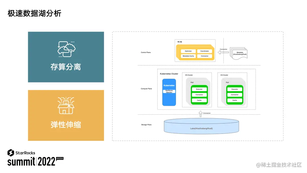 数据湖上的分析往往具有比较强的随机性。如果使用固定资源来支持,通常没有办法最大化利用资源的。而数据湖分析数据往往都在湖中,那么就天然具备了存算分离的特点。基于此,StarRocks 的数据湖分析也实现了计算资源的弹性伸缩,是通过以下几步来完成的:第一,我们支持了完全无状态的节点 computer node 这样就可以能够做到快速在集群中增删节点。第二,将 StarRocks 与 K8S 集成,通过 K8S 完成资源管理与编排,就能够实现在资源紧张的时候增加节点,在资源充裕的时候释放节点,从而能够实现计算资源的弹性伸缩。另外 StarRocks 当前也支持在一个集群内创建不同的 compute node 组。用户可以指定使用不同的物理资源来执行具体的查询请求,这样能够将不同类型、不同优先级的业务在物理层面进行隔离。